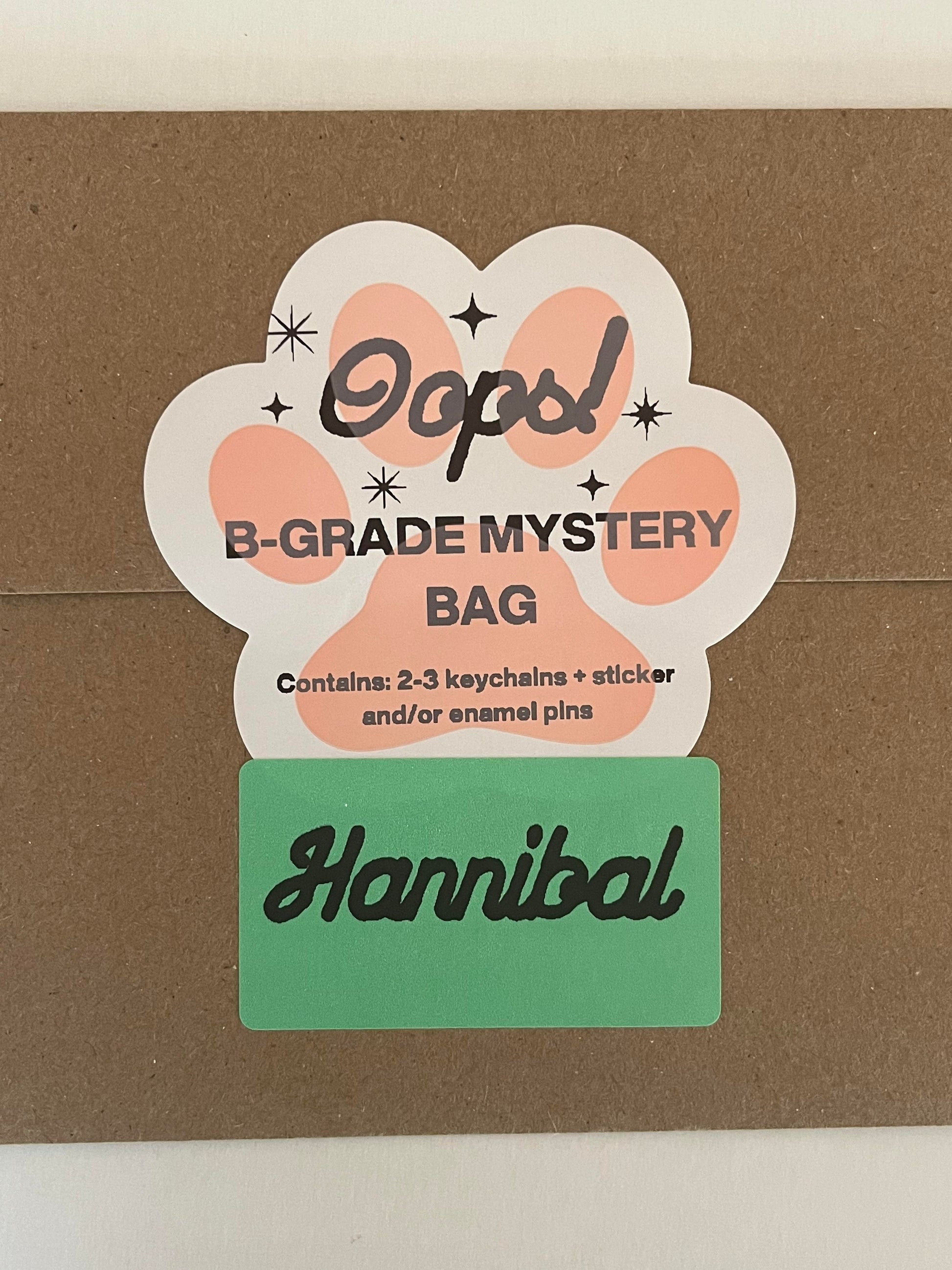 Each mystery bag contains 2-3 keychains, labeled B-grades due to printing errors such as color inconsistency, for a discounted price. Still lovable!