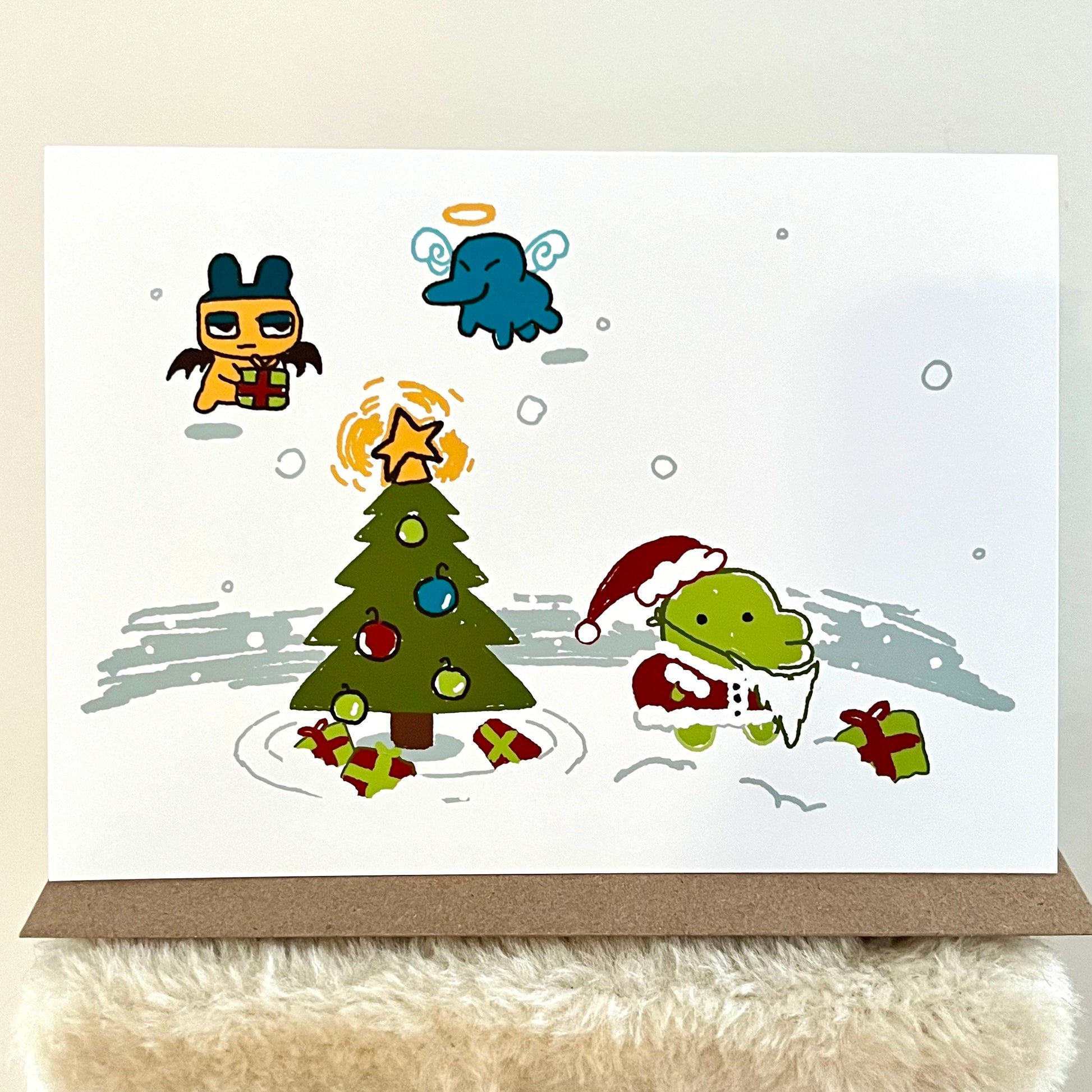 Double-sided holiday greeting card with a blank interior and brown kraft envelope, ft some of the tama gang festive in the snow.